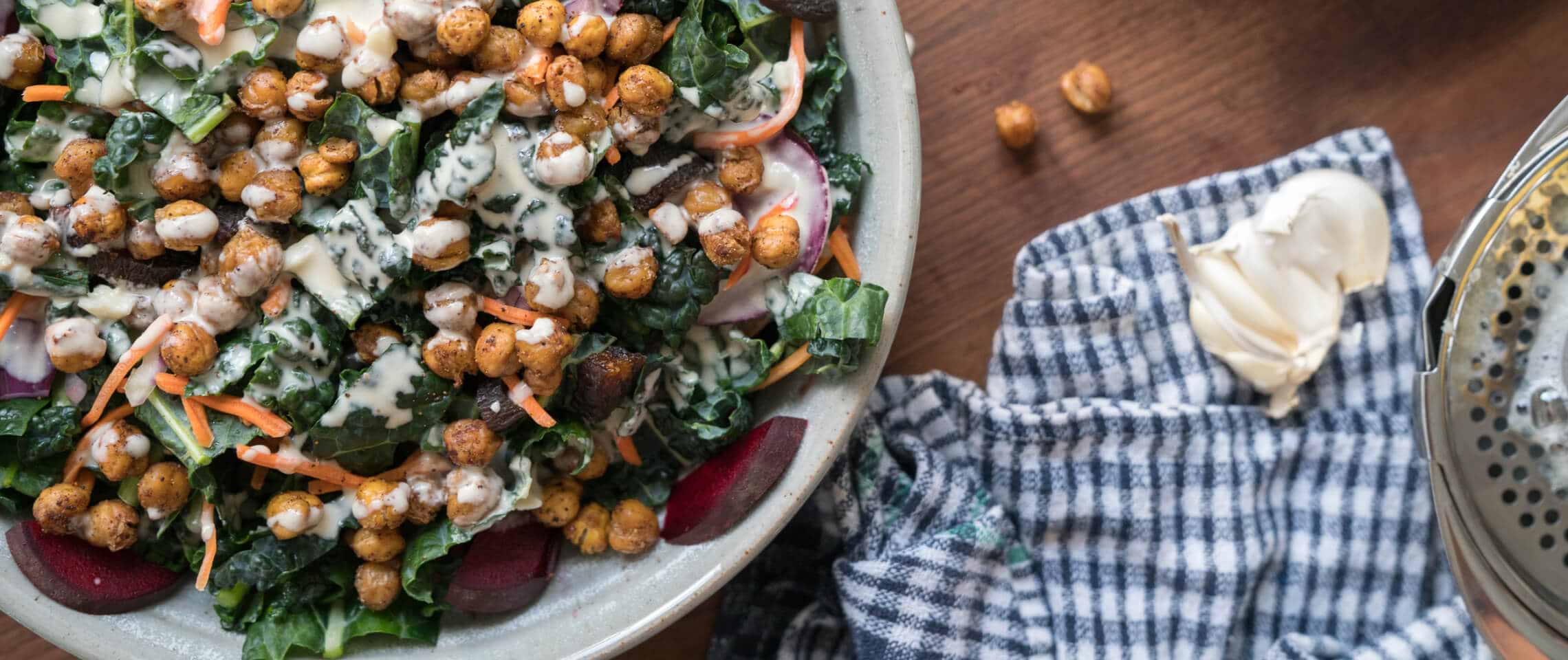 When it comes to eating, my meals reflect the current weather which is why this Roasted Chickpea Kale Salad with Creamy Dressing is perfect this time of year, not the cucumber salad which is very cooling to the body.