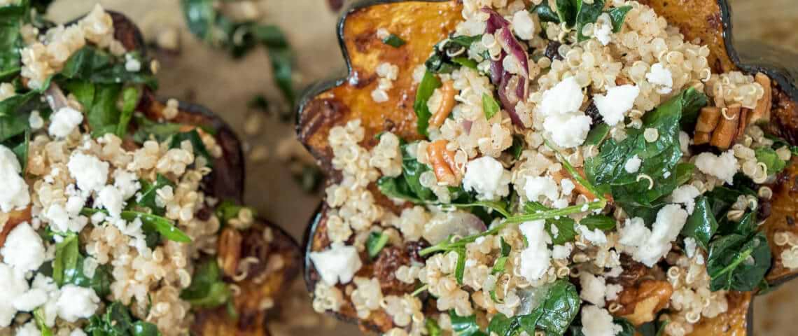 Cozy and nourishing – this Quinoa Stuffed Acorn Squash recipe is packed with plant-based protein, veggies, and warming spices. It’s a delicious vegan and gluten-free dish.